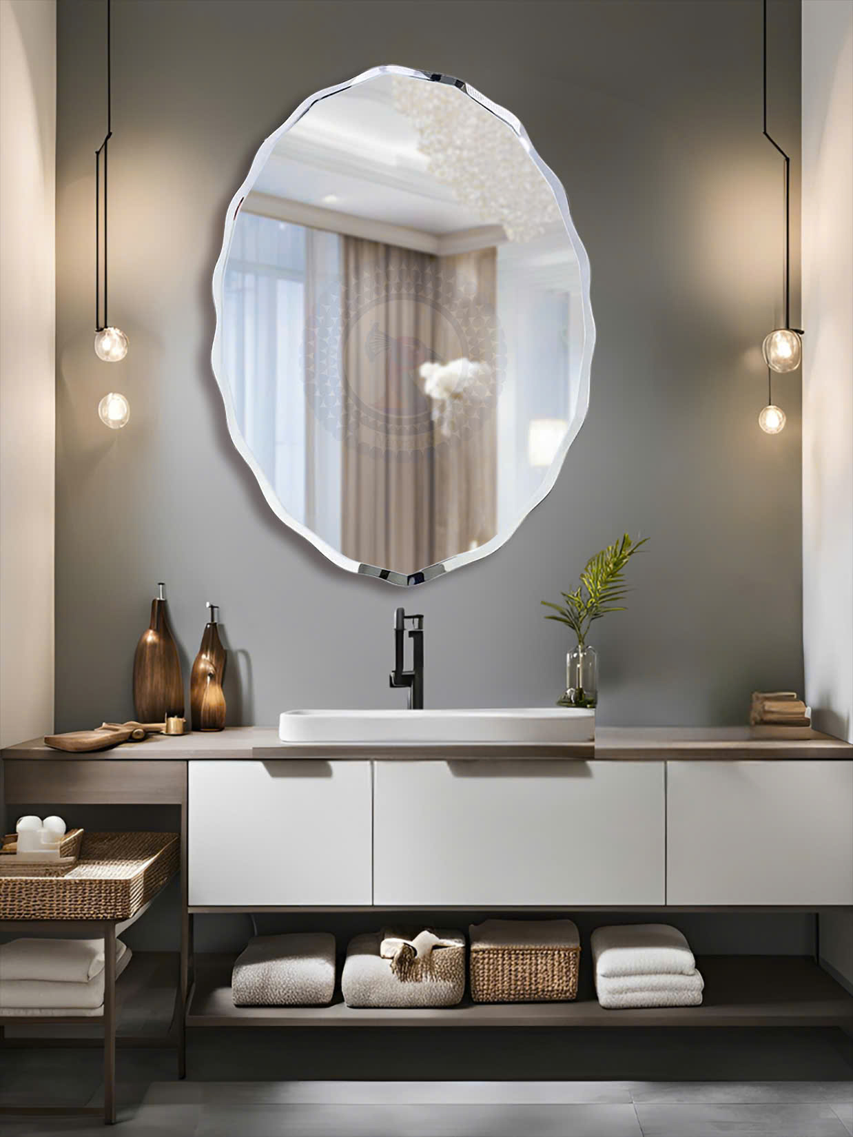 Gương mài nghệ thuật bo cạnh là mẫu thiết kế tối giản, hiện đại đầy tinh tế đem lại cho không gian nhà bạn sự sang trọng, cổ điển cũng như tôn lên giá trị của ngôi nhà. Với việc tận dụng nguồn sáng tự nhiên mặt gương bên trong được dùng với kính sáng màu đem lại hình ảnh, màu sắc chân thực nhất cho chủ thể sở hữu. Đường viền của gương được cách điệu thiết kế tựa những làn sóng uốn lượn bao quanh mặt gương bên trong tạo sự nhẹ nhàng, quyến rũ cho mẫu gương này. Như cái tên của gương nhà tắm mài vát nghệ thuật, đường viền của thiết kế được bo cạnh, kết hợp khéo léo với tạo hình trên mặt kính mang lại sự thanh thoát, không hề nhàm chán thu hút người xem từ cái nhìn đầu tiên. Dáng hình thanh lịch, lịch lãm kết hợp với thiết kế thông minh, tiện ích, đây là mẫu gương rất đáng được sử dụng với những không gian như phòng khách, phòng ngủ, phòng trang điểm, phòng tắm,...