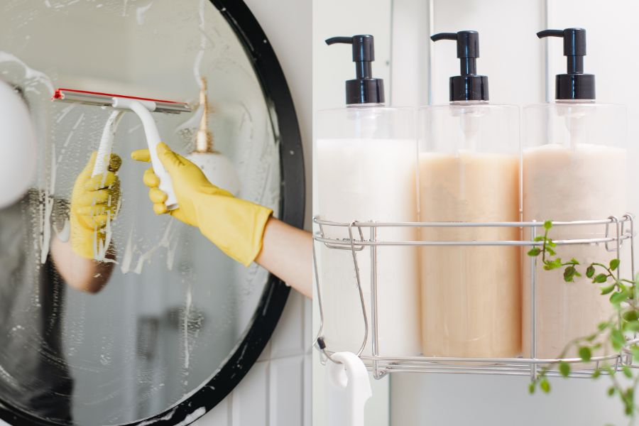 Không dùng nước tẩy bồn cầu: Các hóa chất gốc axit mạnh sẽ gây "cháy" lớp tráng bạc ở mép gương ngay lập tức.