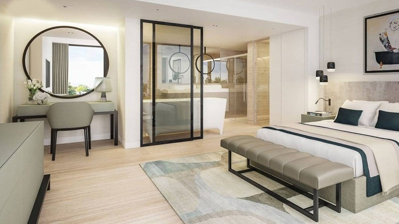 Tại đây, gương vẫn đáp ứng tốt nhu cầu soi ngắm, trang điểm nhưng lại không tạo ra sự phản chiếu trực diện vào người đang nằm. Cách bố trí này của Navado giúp không gian phòng ngủ có chiều sâu hơn mà vẫn đảm bảo tính riêng tư tuyệt đối.