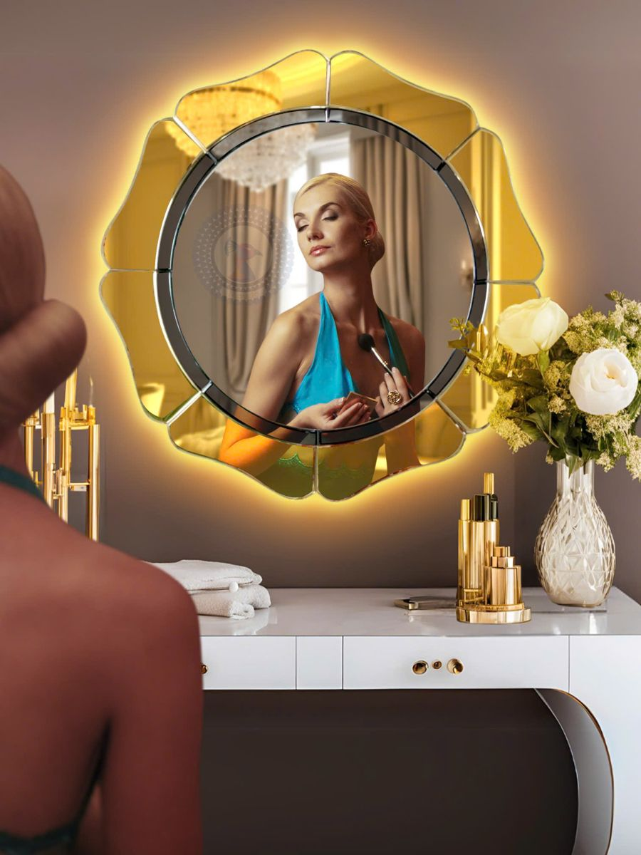 Sản phẩm là minh chứng cho trình độ cắt mài thủ công bậc thầy của nghệ nhân Navado. Hình dáng uốn lượn mềm mại kết hợp dải LED hắt sau tạo cảm giác chiếc gương như đang lơ lửng trên tường.