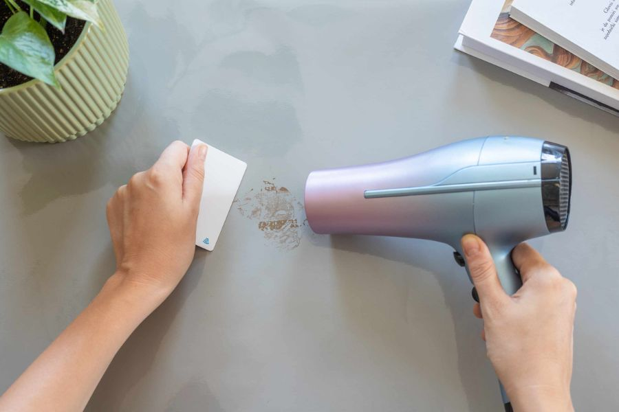 Đối với những vết băng dính lâu ngày đã bị khô cứng, nhiệt độ là chìa khóa. Nhiệt từ máy sấy tóc sẽ làm lớp keo chuyển sang trạng thái lỏng hóa.