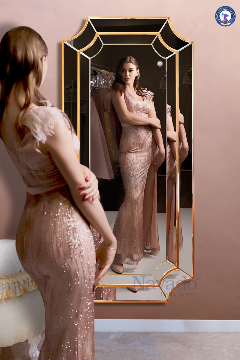 Mẫu gương soi toàn thân Navado khung kim loại mạ vàng được hoàn thiện thủ công, từng mối hàn, đường bo đều được xử lý tỉ mỉ. Lớp mạ vàng cao cấp không chỉ tạo hiệu ứng thẩm mỹ mà còn chống oxy hóa, bền màu theo thời gian.